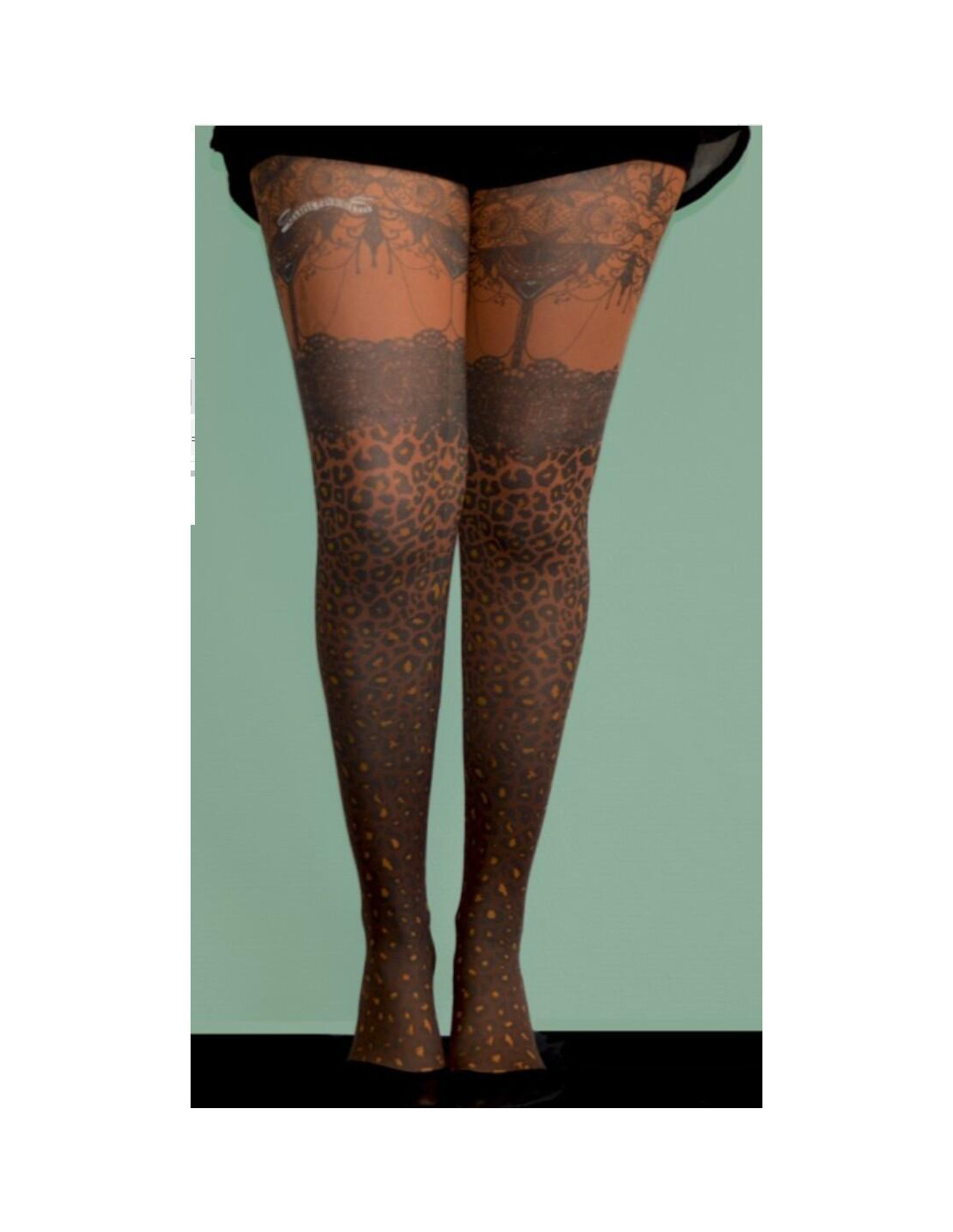 Des Collants imprimés Marieantoilette ludiques et sauvages tendance brune avec les taches caractéristique d'un des rois des savanes le Léopard.