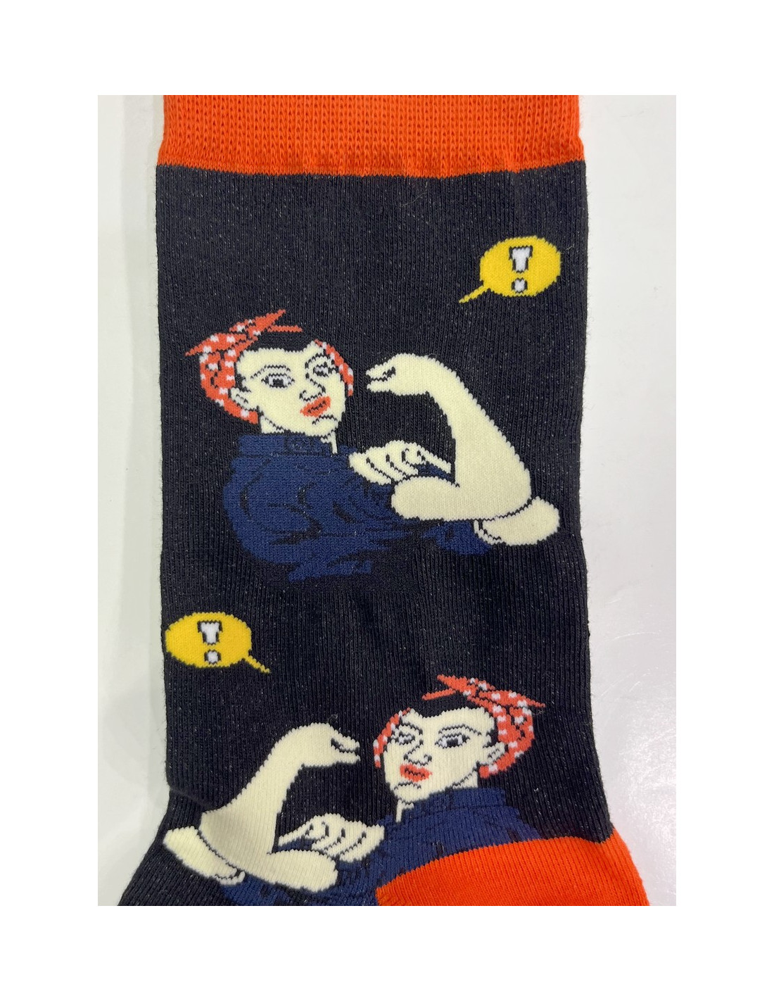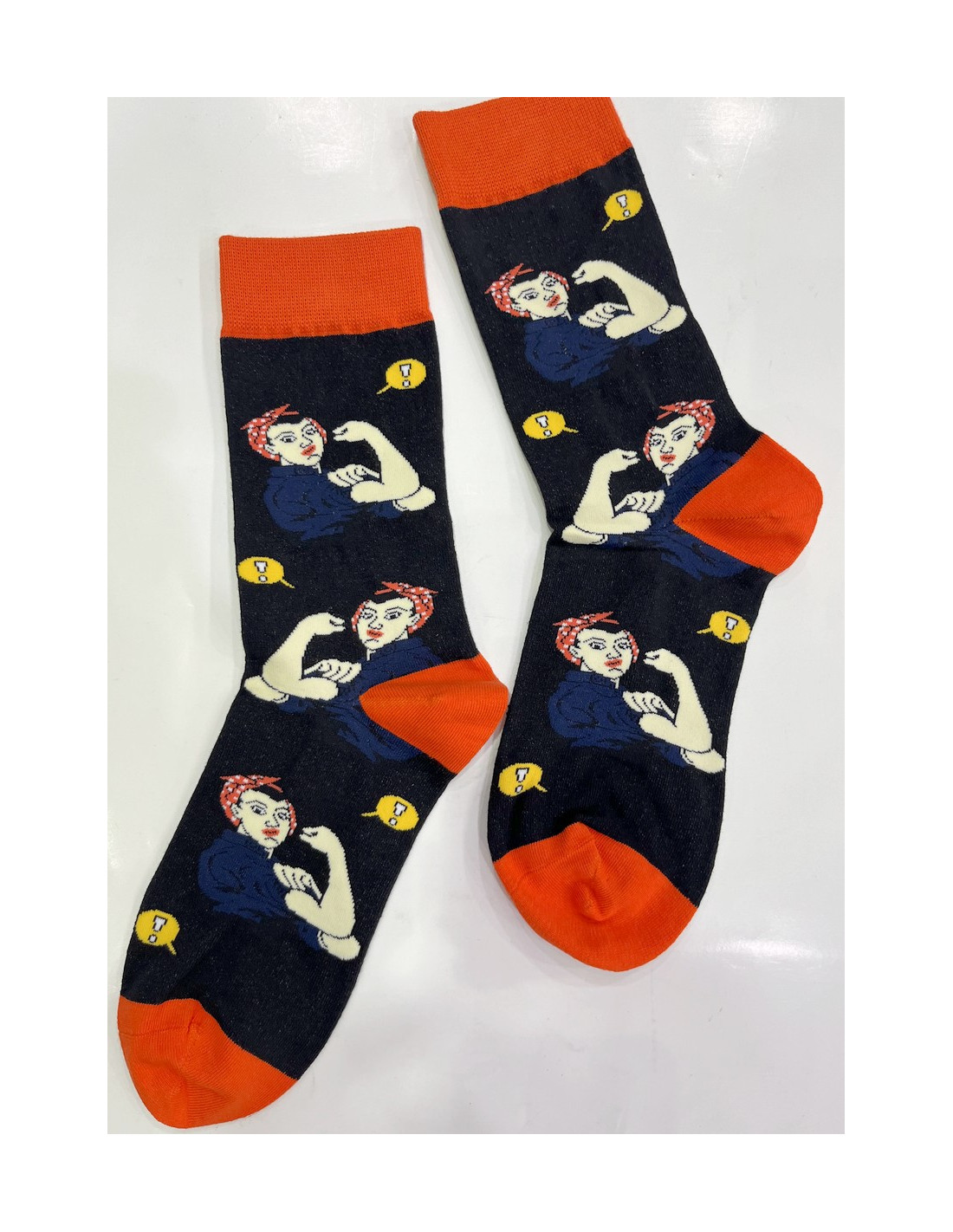 Chaussettes en coton originale ludique , ces jolies chaussettes noires fantaisie mettent les femmes à l'honneur, depuis un symbole du féminisme, Rosie la riveteuse