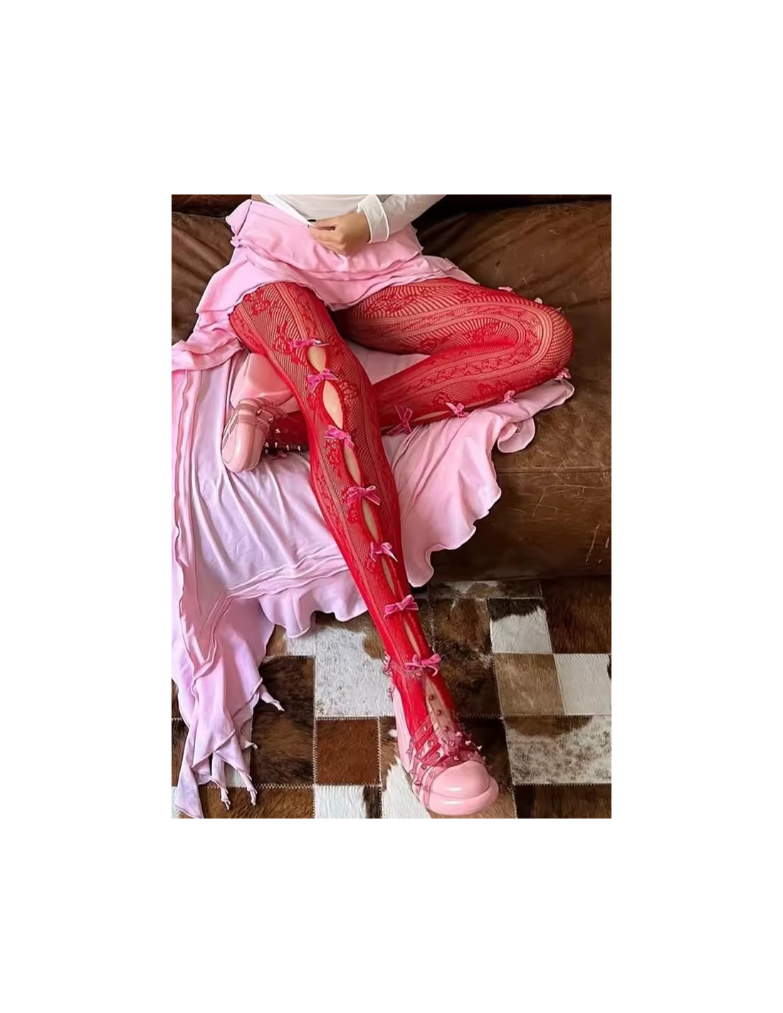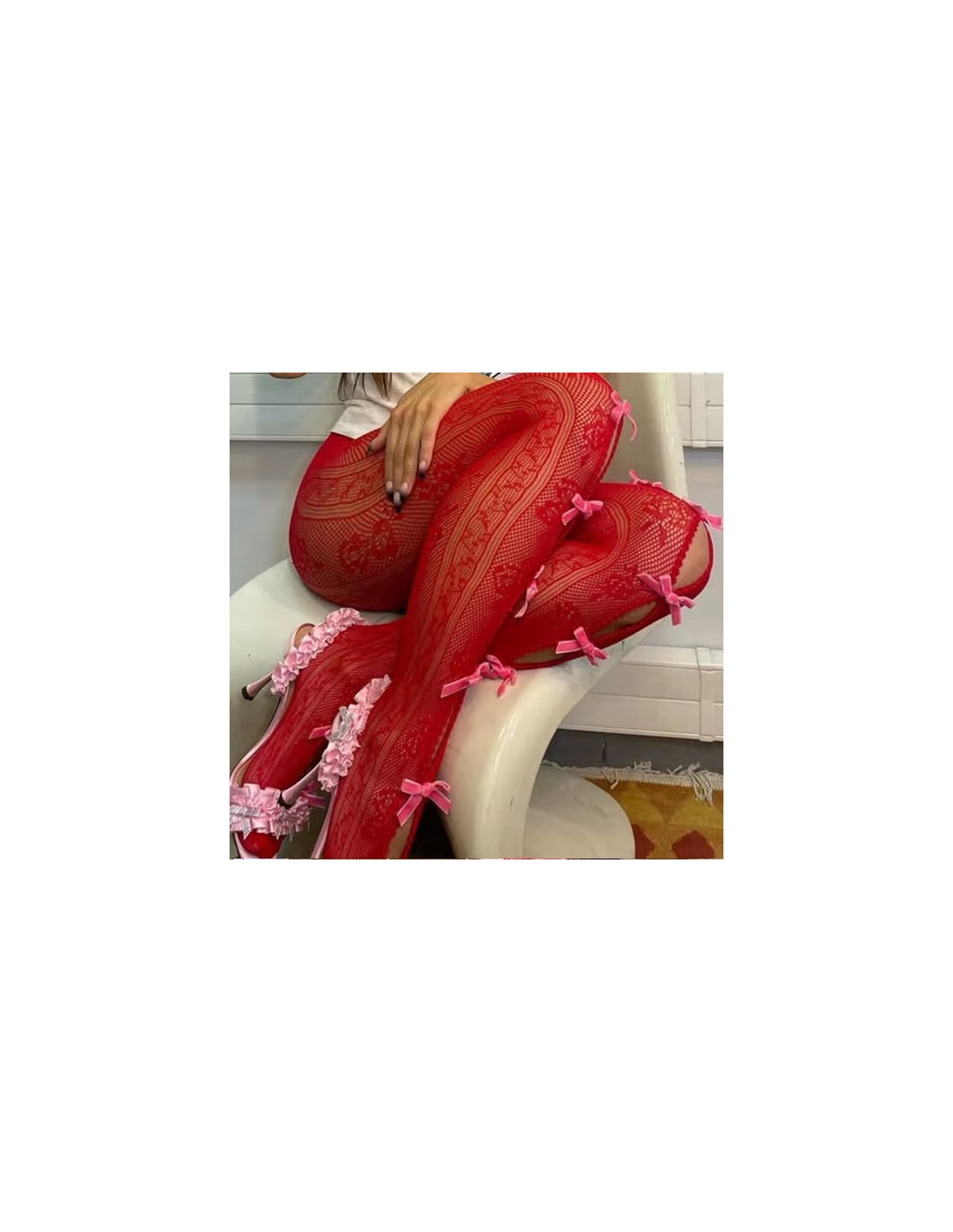 Collant-resille-dentelle-à rubans-rouge-noeud-rose-assis