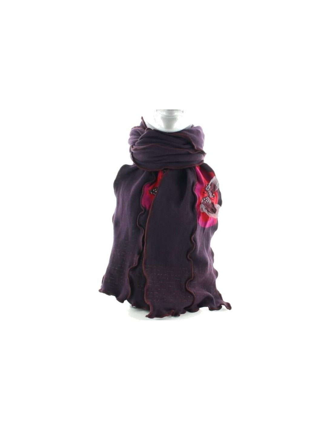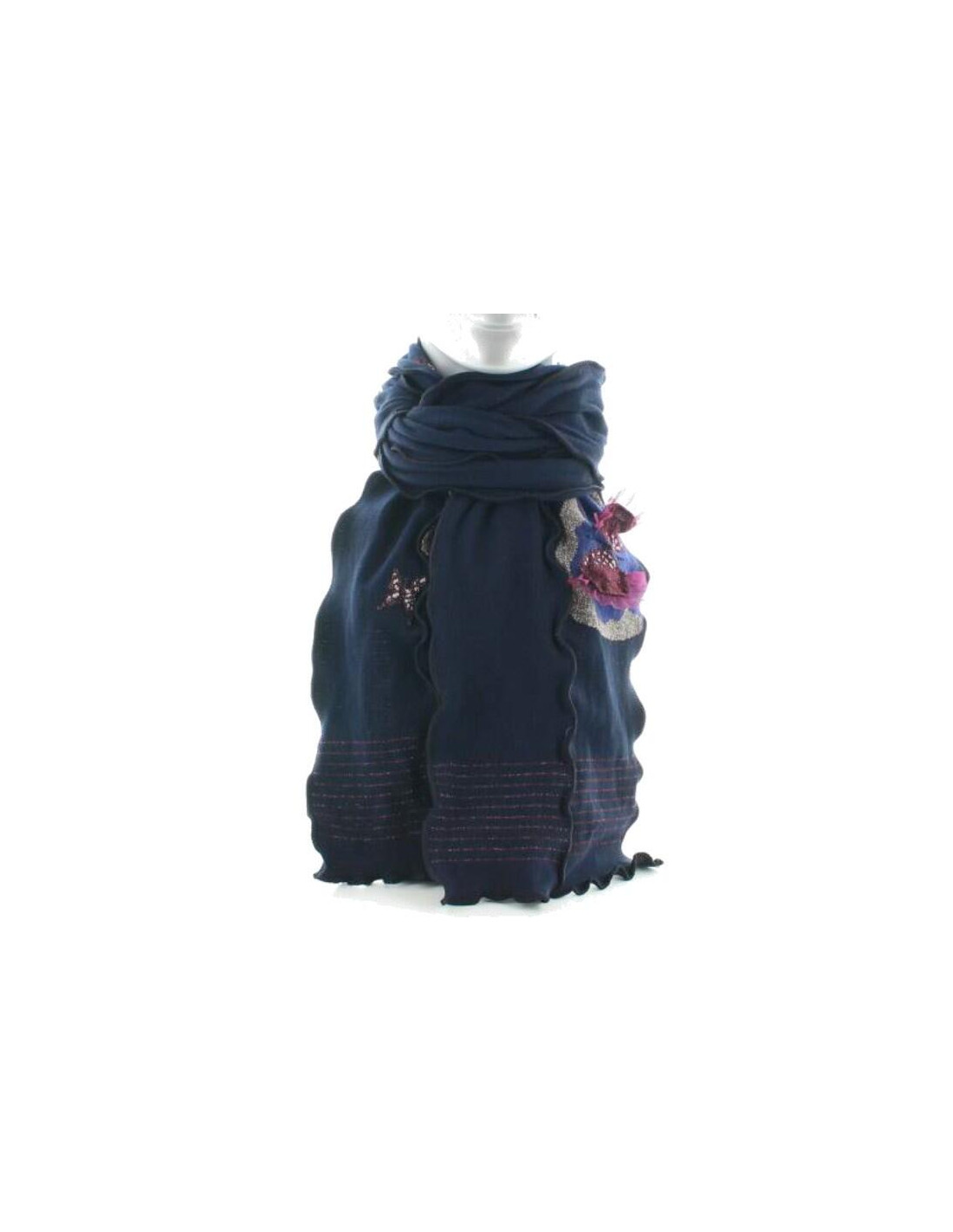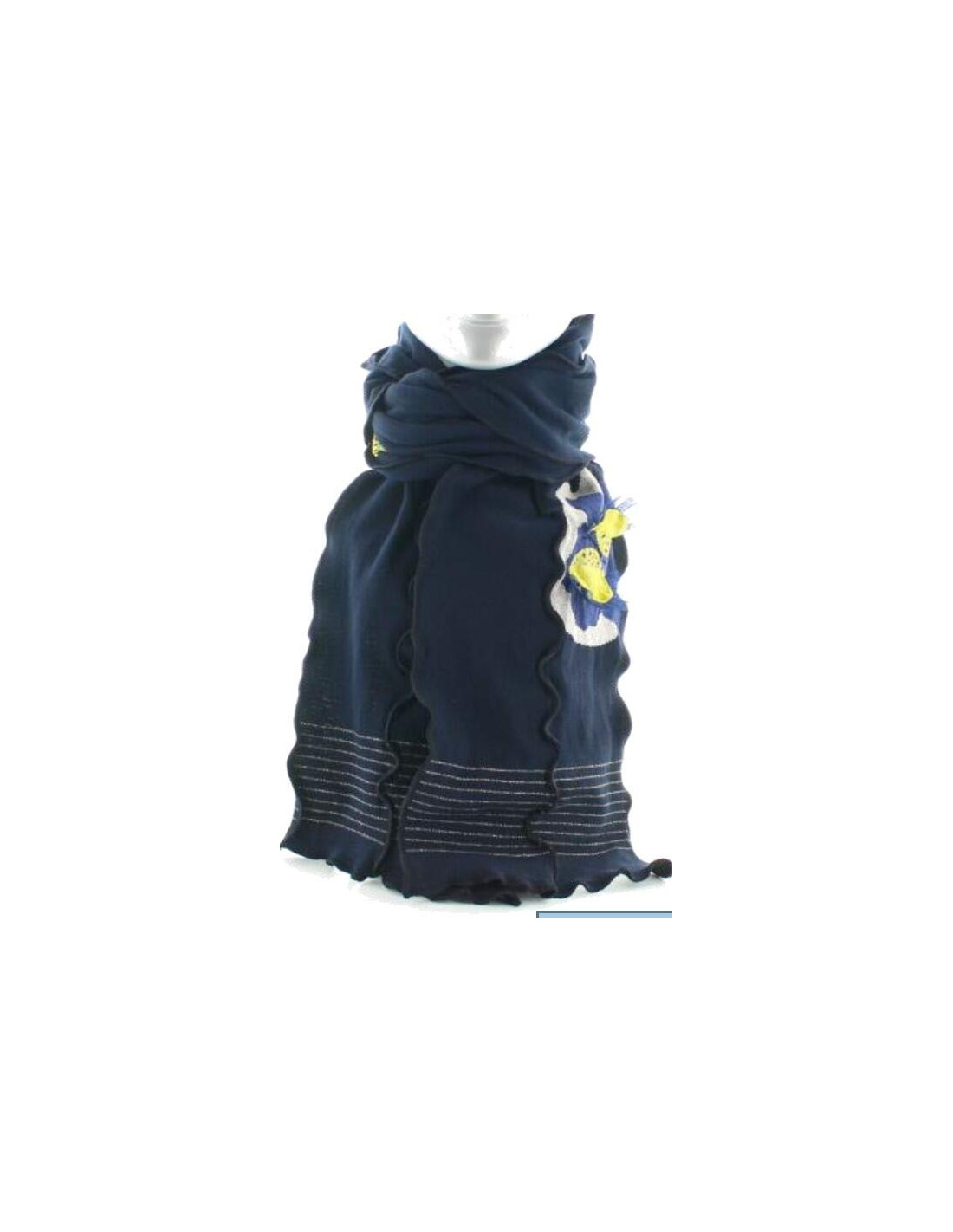 Cette écharpe de 1m60 et de 35 cm de large permet une certaine excentricité. idéalement le joli motifs aux Papillons est surprenant pour sa dentelle qui en orne les ailes, l'association des couleurs est assez jubilatoire