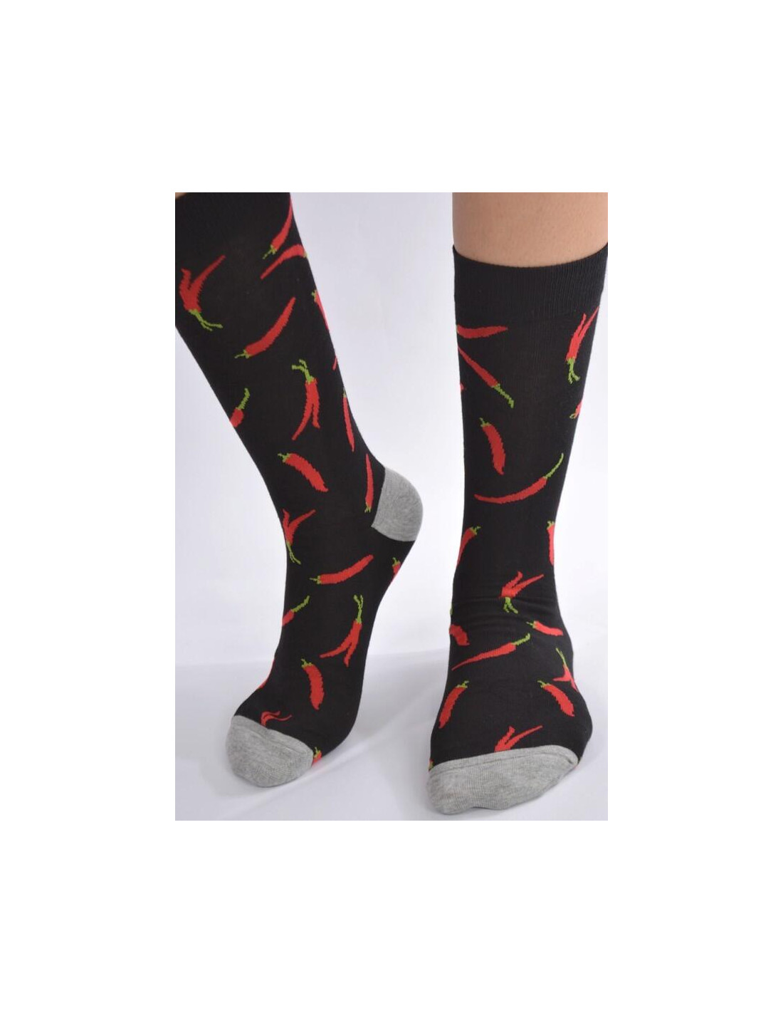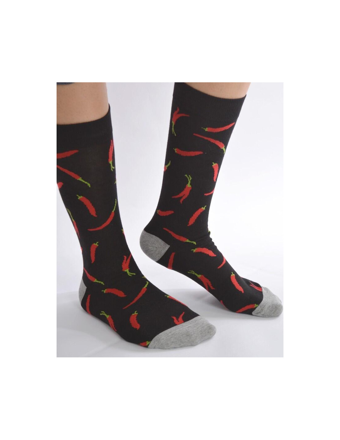 Ces chaussettes ludiques et tendances base noires sont rigolotes, avec les motifs piments rouges.