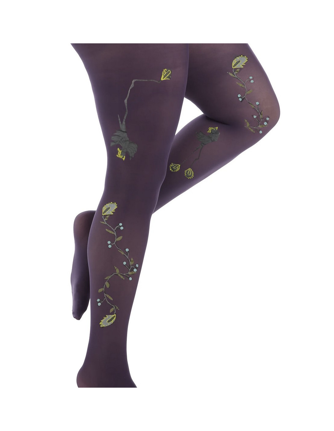 Collants Berthe aux grands Pieds en microfibre d'un bel effet fleuri à joli oiseaux opaque souple tendance à porter en violet prune